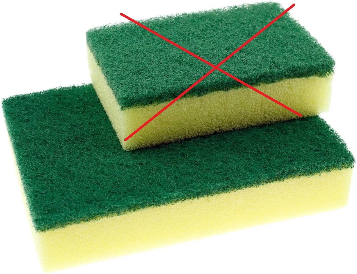 De groene schuurzijde is alleen te gebruiken op krasbestendige ondergronden.