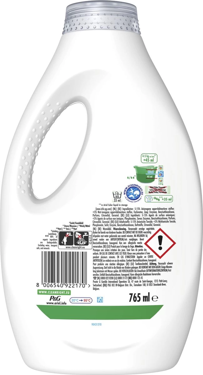 - Recyclebare verpakking: Ariel vloeibaar wasmiddel wordt geleverd in een recyclebare verpakking