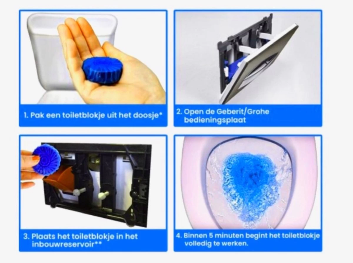 Wil je graag รฉรฉn super schoon en frise Toilet? ben je klaar met zelf te kuisen? dan is dit zeker iets voor u! De toiletblokjes gaan 4 weken mee en bevatten eco-vriendelijke pigmenten. De knal blauwe blokjes werpt u in de toilet inbouwreservoir. Ze komen automatisch terecht in het reservoir en u hoeft niet meer te klungelen met toiletblokjes die in uw pot hangen. Vaak valt het toiletblokje dat in uw pot hangt in het toilet en het vervangen is vaak geen smakelijk klusje.