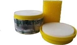 Maak de spons nat en veeg door de pot Relax poetssteen om de witte poetssteen op te nemen in de spons.