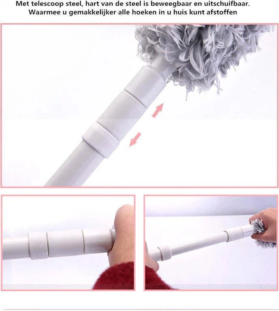Dankzij de uitschuifbare telescoopsteel is het makkelijk om stof te verwijderen op hoge posities bijvoorbeeld u plafond of de bovenkant van u deurrand of kast.