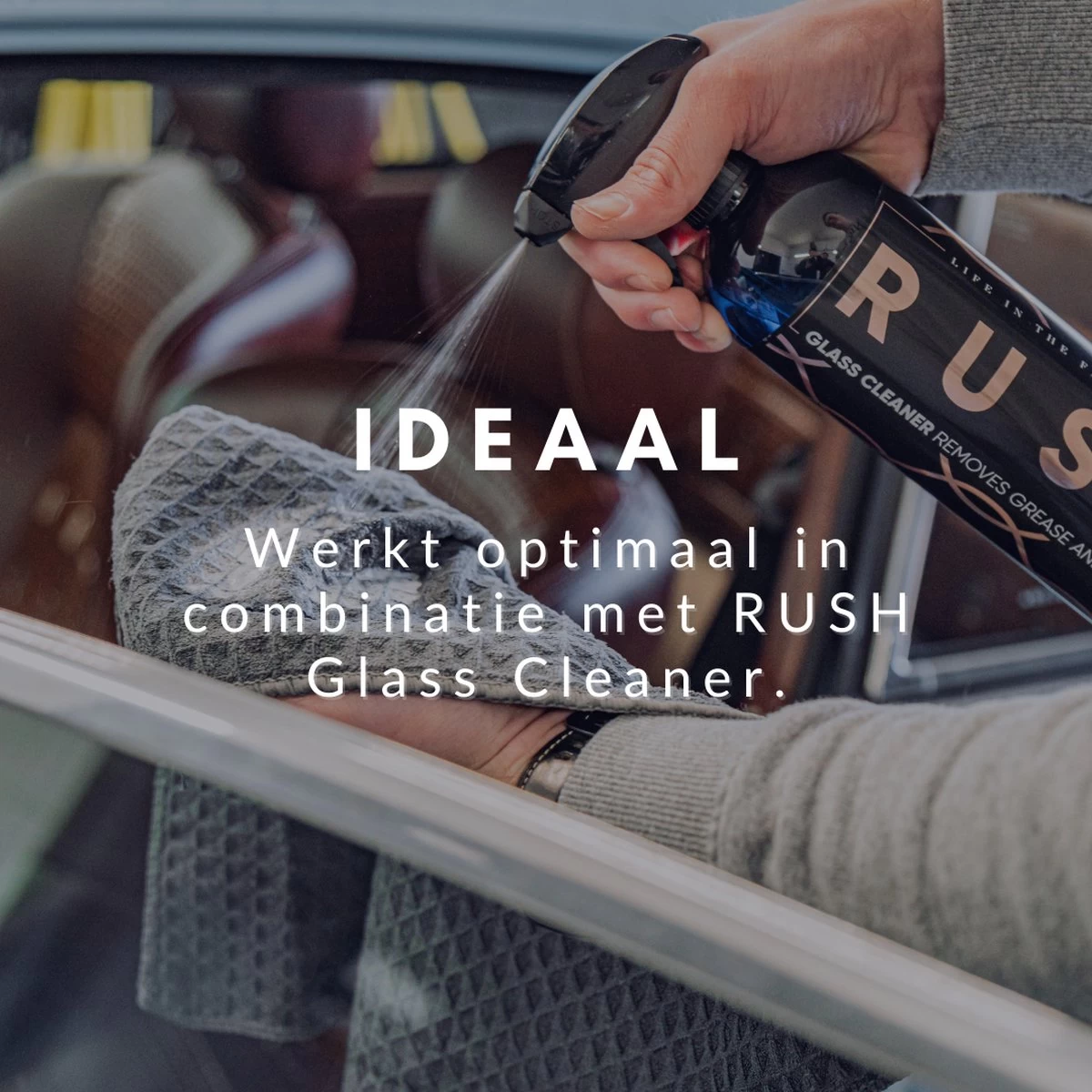 Verdeel RUSH Glass Cleaner gelijkmatig over รฉรฉn van de twee glasdoeken. Voor de gewenste uitstraling kun je het oppervlak meerdere keren afnemen met de natte glasdoek. Vervolgens gebruik je de tweede glasdoek om de laatste resten vuil en stof te verwijderen en de ruiten vlek- en streepvrij af te nemen.