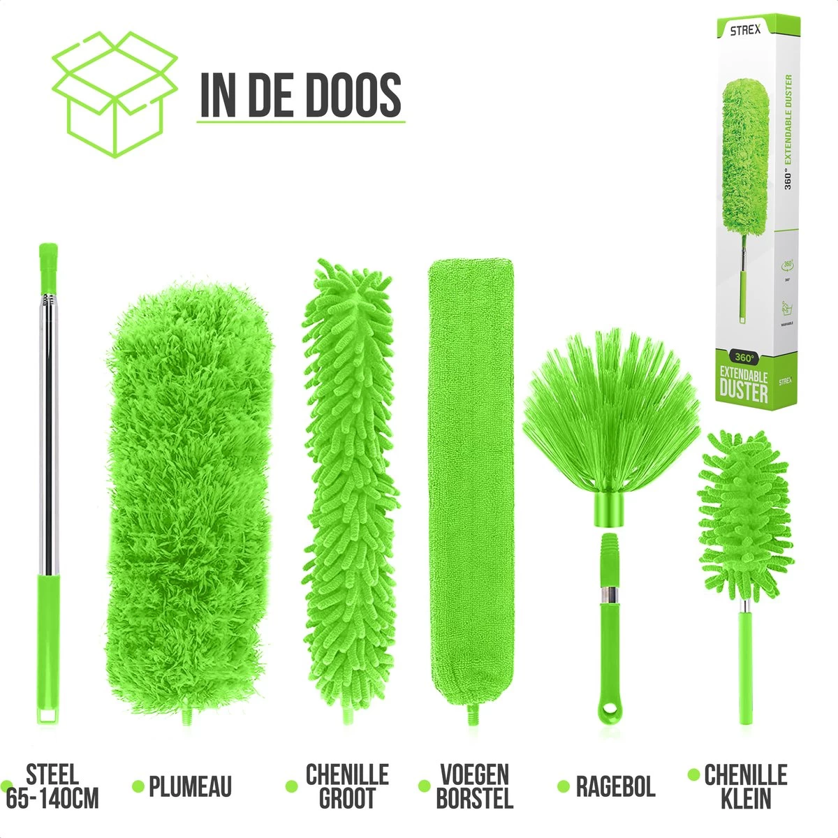 Ook zo klaar met hoge spinnenwebben en stof? Met de 5-delige Strex telescopische plumeau set kom jij makkelijk bij het plafond. De microvezel kop neemt elektrostatisch stof, pollen en andere deeltjes op en vangt deze op als een magneet. Door het stevige maar lichtgewicht ontwerp wordt schoonmaken efficiรซnter dan ooit.