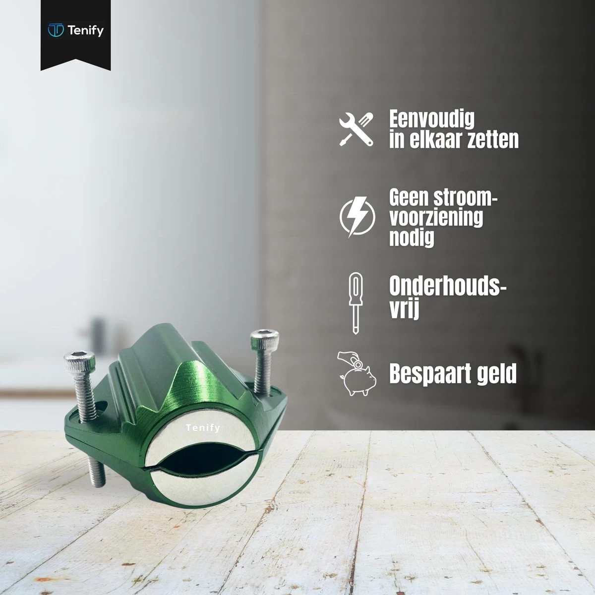 Door middel van onze Tenify magnetische waterontharder voorkom je kalkaanslag op huishoudelijke apparaten. De waterontharder beschermt uw waterleidingen, wasmachine, droger, sanitair en keukenapparatuur tegen kalkaanslag. De krachtige NdFeB antikalk magnetische componenten creรซren een krachtig magnetisch veld van 7800 Gauss (0,78 tesla) in de waterleidingen, zodat mineralen, calcium en magnesium niet meer kunnen kristalliseren tot calciumcarbonaat (kalkaanslag). Met het eindresultaat dat de bestaande kalkaanslag geleidelijk wordt afgebroken in de waterleidingen en kalk drastisch vermindert tot wel 90%.