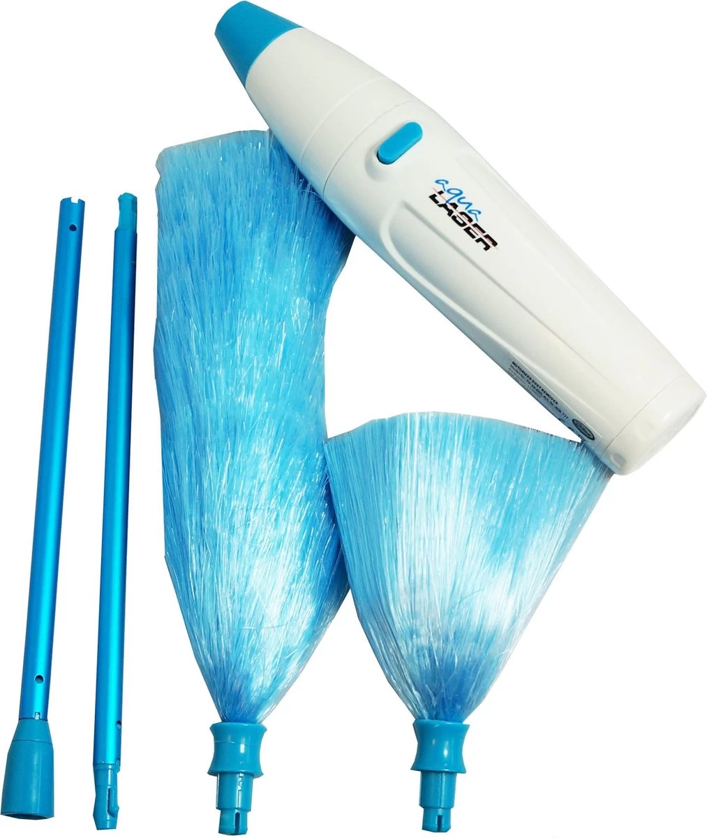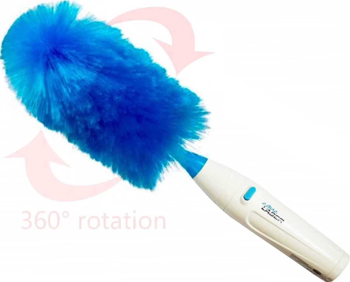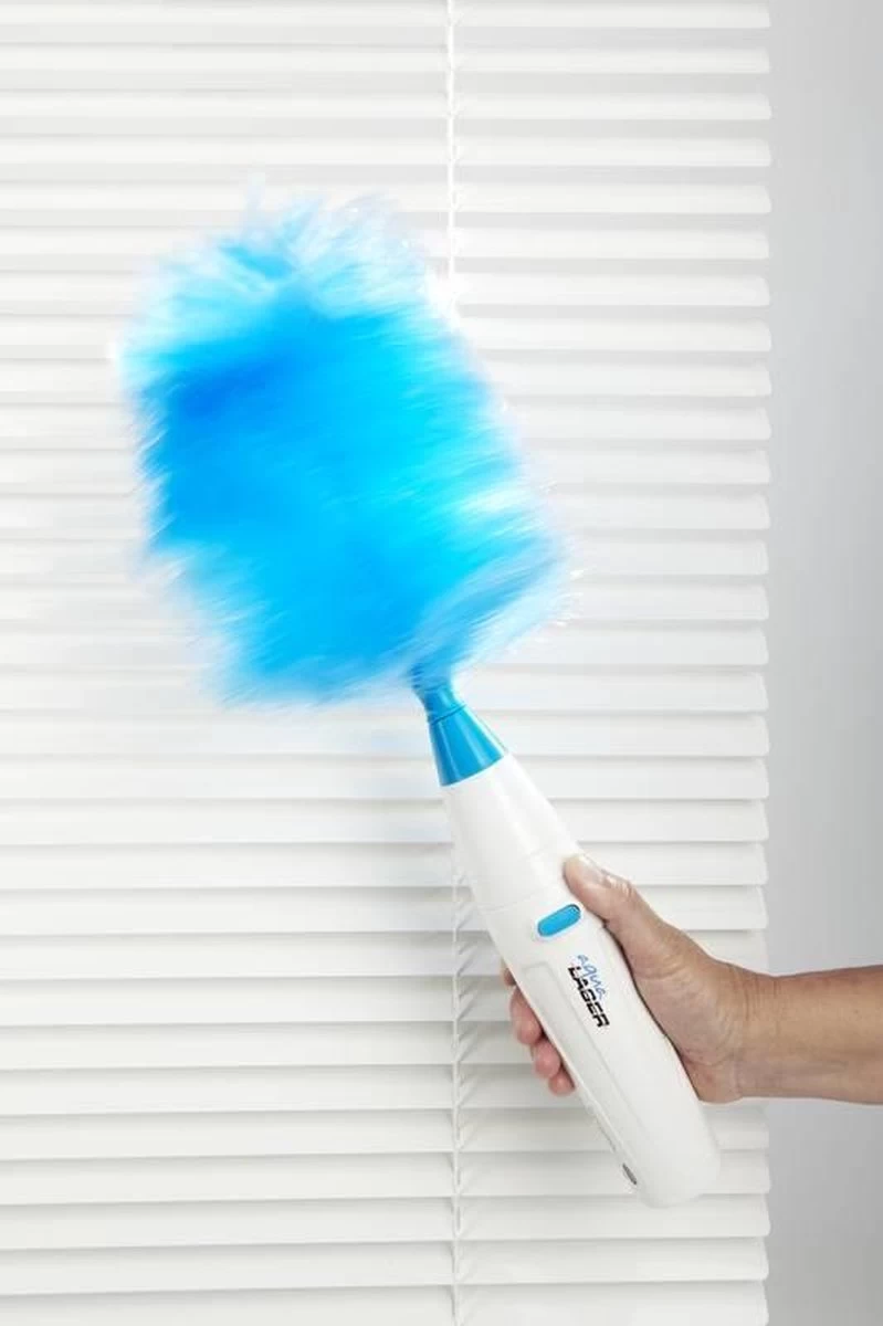 Deze superhandige spinduster op batterijen stoft razendsnel af en is veel veiliger voor kleine, wat wankel staande snuisterijen dan een gewone stofdoek. Elektrostatisch geladen haren trekken overal stof uit en vangen stof op. De Aqua Laser Turbo Duster heeft super zachte borstelharen, die zich aanpassen aan elke vorm van uw meubels en zachtjes stof weg-spinnen. Geen behoefte meer aan een veren stofdoek, doek of stof-reiniger. Boekenplanken, jaloezieรซn, meubels, gleuven, hoeken en andere moeilijk bereikbare plaatsen, ze zijn allemaal gemakkelijk af te stoffen. Met de verlengsteel kom je gemakkelijk bij hoger gelegen plekken als bovenop de boekenkast. De plumeaus zijn wasbaar en kunnen met de hand worden afgespoeld en vervolgens aan de lucht worden gedroogd.