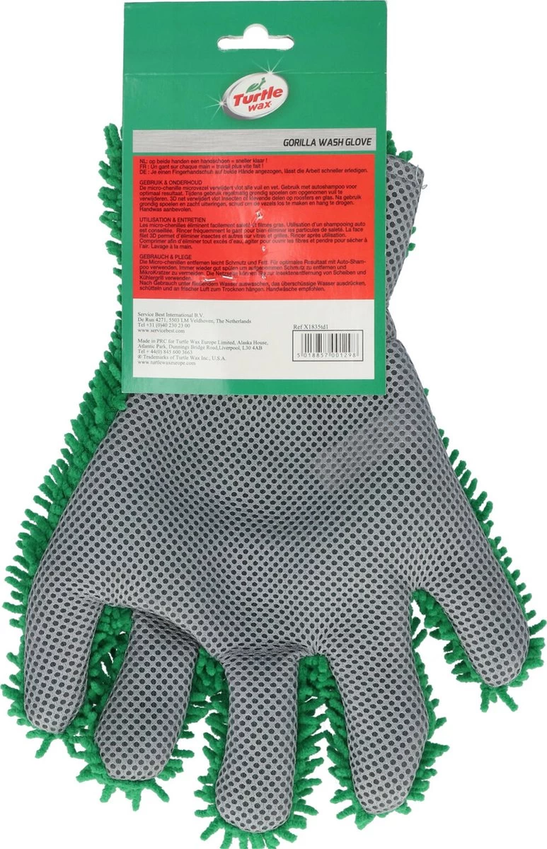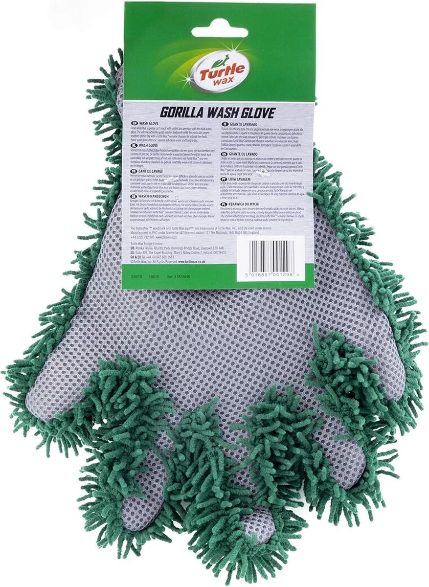 De Turtle Wax Gorilla washandschoen is de ideale hulp bij het wassen van de auto. Alleen een water met auto shampoo oplossing is voldoende voor het makkelijk schoonmaken. Door de perfecte pasvorm van de Gorilla handschoen is er nog beter contact mogelijk tussen hand en oppervlak, waardoor het oppervlak nog grondiger kan worden gereinigd. De handschoen heeft twee verschillende kanten; een microvezel en een 3D insectennet.