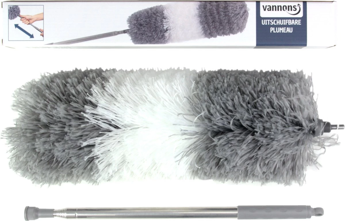 Met deze uitschuifbare en buigbare plumeau bereik je zelfs de lastigste en hoogste plekjes in huis. De stang is uitschuifbaar tot 2 meter 45 en de kop van de plumeau kun je in allerlei bochten buigen zodat je zelfs bovenop de hoogste kast of in de nok van je huis kunt stoffen. De plumeau vangt het stof op en deze kun je gemakkelijk uitspoelen onder de kraan!