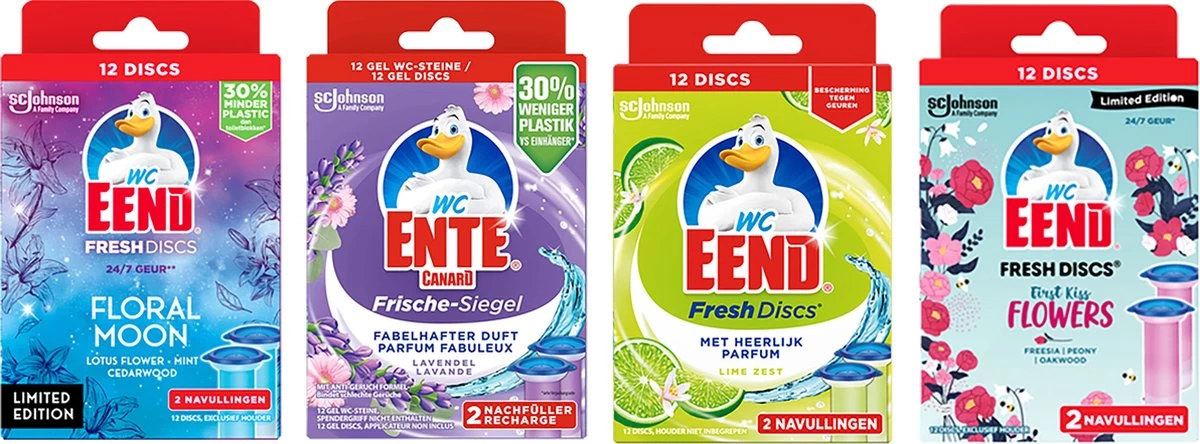 Wc-eend fresh discs duo navulling floral moon, lime, First kiss en Lavandel bevat bevat 12 gel discs die het toilet reinigen en verfrissen bij iedere spoelbeurt. Beschermt tegen kalkaanslag.