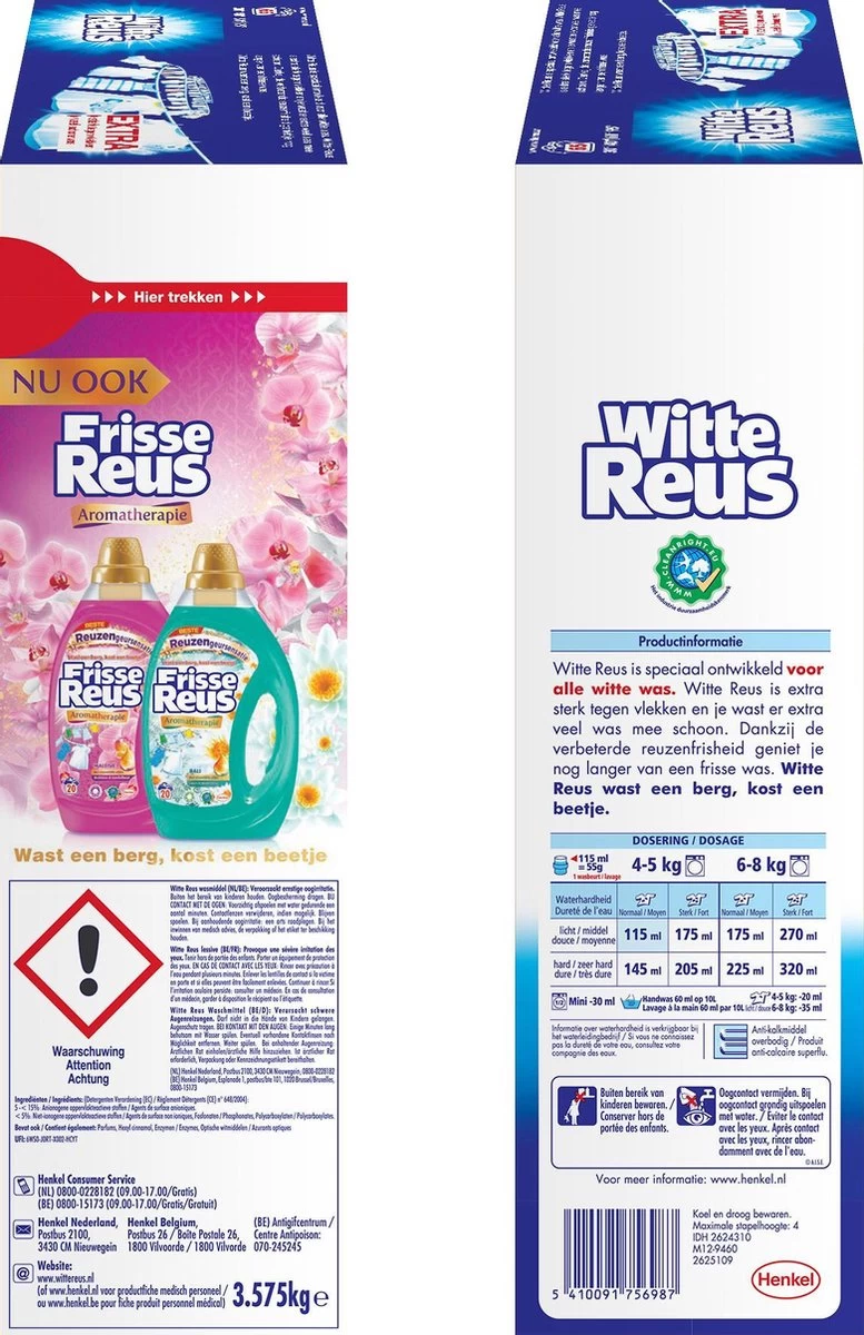 Witte Reus waspoeder is een wasmiddel speciaal ontwikkeld voor alle witte was en bevat de vertrouwde Witte Reus reuzenwaskracht. Extra sterk tegen vlekken, extra veel schone was.